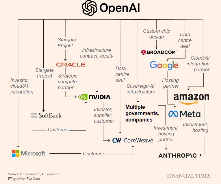 Beyond recent headline deals, Nvidia, CoreWeave, and some of the actors involved also invest in AI startups. Big Tech’s relationships with Anthropic mirror aspects of this structure. But OpenAI remains the loudest signal, the clearest epicenter. Everything flows through Sam Altman’s company, making it the keystone upon which the entire structure depends.