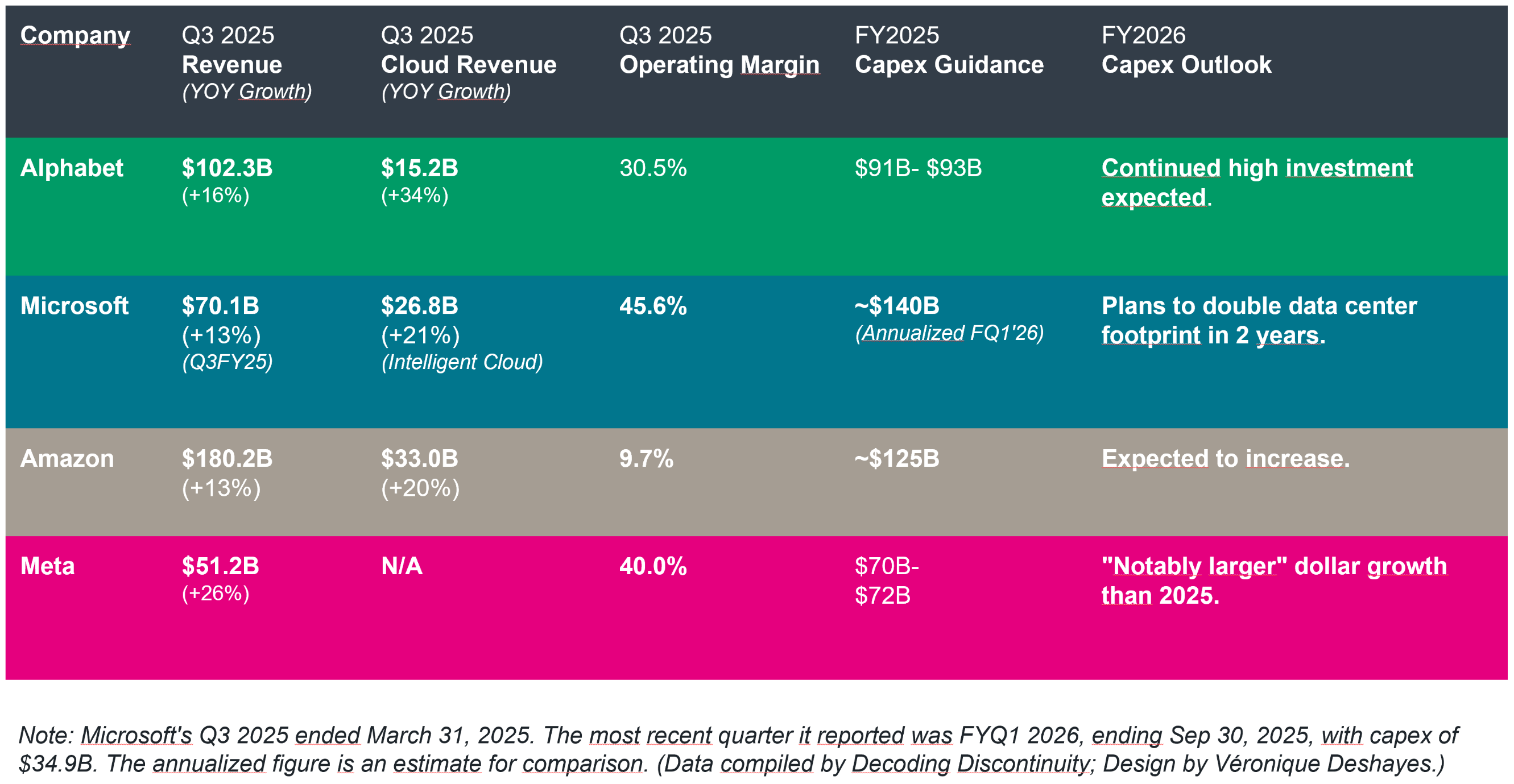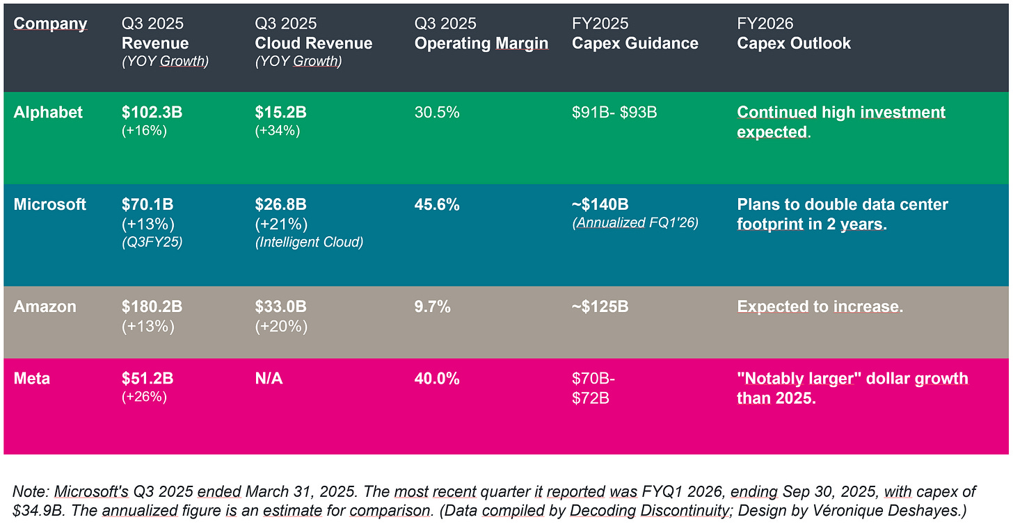 The Q3 2025 earnings season delivered (again) a string of staggering capital expenditure figures from Microsoft, Google, Amazon, and Meta. The projected $400 billion of spending in 2025 is intended to serve as the financial foundation for the durable growth moats over the next decade.